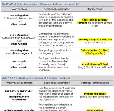 Bivariate statistics explore the relationships or differences between two variables. Here's how to choose the right test (see the table below):