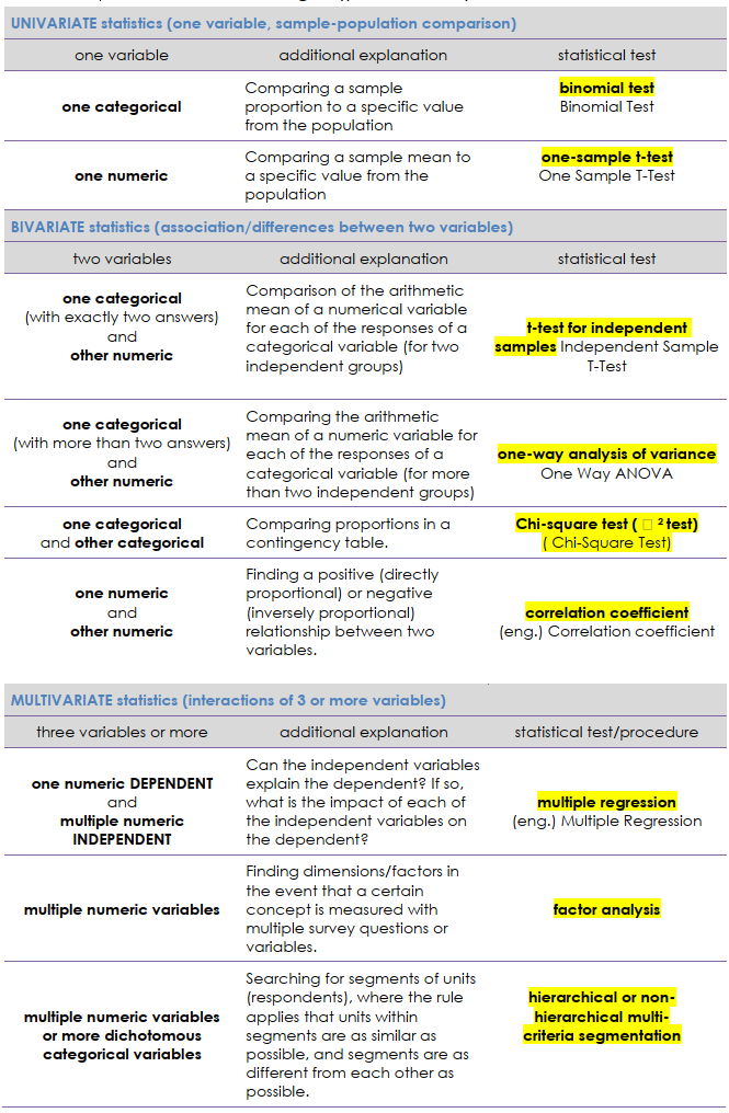 Univariate statistics involve analyzing a single variable. When comparing a sample to a population we suggests the following (for details see the table below):