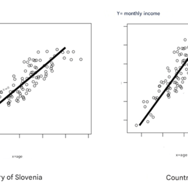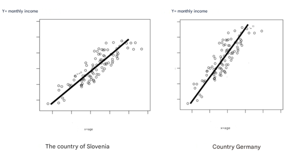 In the mentioned hypothetical example, the correlation coefficient is misleading, since the linear relationship between age and income is present in both countries, but the “slope of the line” in Germany is significantly “steeper” than in Slovenia. This means, in other words, that respondents in Germany achieve relatively high incomes with fewer years or earlier. However, since the deviations from the straight line are exactly the same in both countries, despite the different "slope of the line", the correlation coefficient is the same in both countries, so in this
